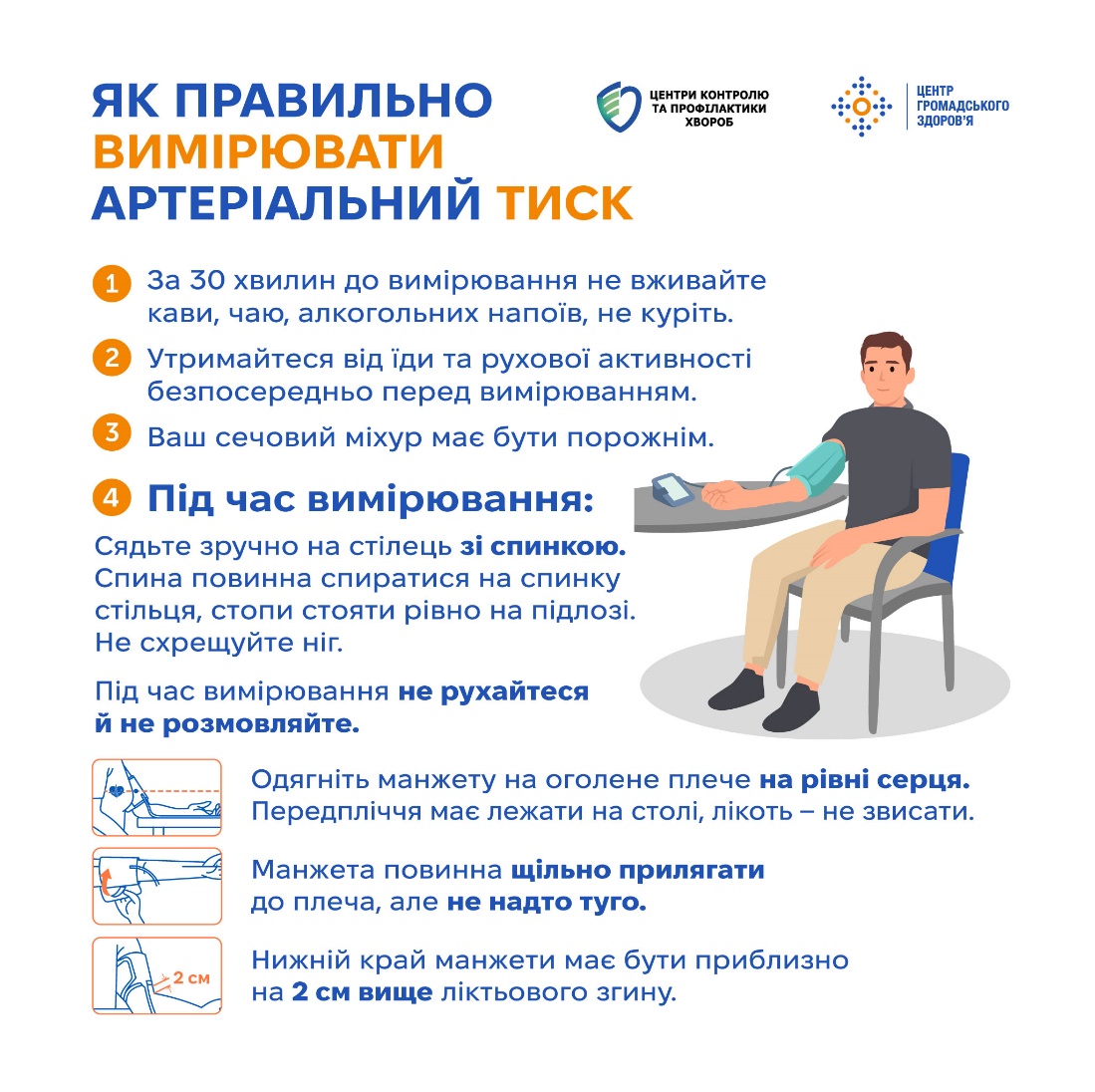 – під час вимірювання сядьте зручно, спиною зіпріться на спинку стільця, стопи поставте на підлогу, не схрещуйте ніг;