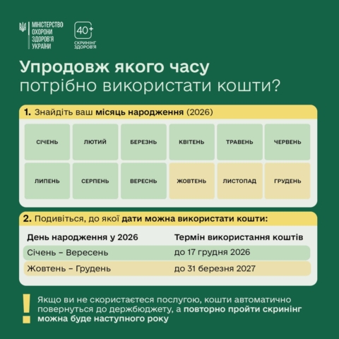Кіровоградський ОЦКПХ МОЗ України спільно з Центром громадського здоров’я України та Міністерством охорони здоров’я України повідомляє: запрошення за програмою «Скринінг здоров’я 40+» надходить через 30 днів після дня народження.