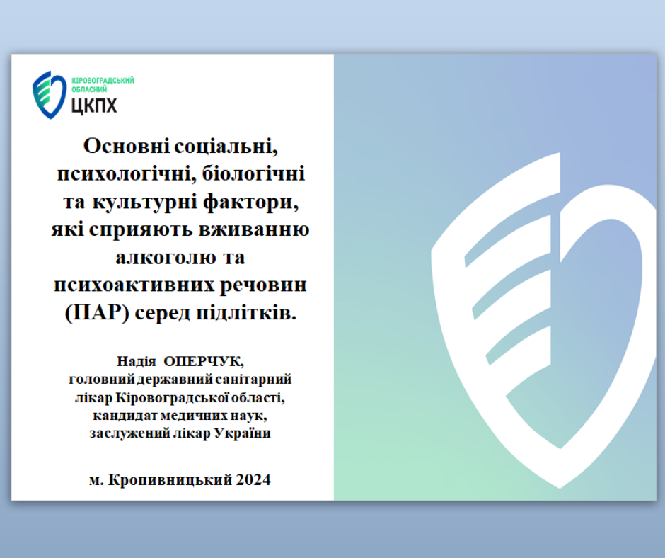 Головна державна санітарна лікарка області Надія Оперчук разом із завідувачем відділу епідеміологічного нагляду (спостереження) та профілактики неінфекційних захворювань Кіровоградського обласного центру контролю та профілактики хвороб Дмитром Орловим провели захід безперервного професійного розвитку (БПР) – обласний онлайн майстерклас на тему «Фактори ризику вживання алкоголю та психотропних речовин серед підлітків».